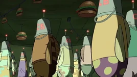 The Chum Slaves were regular Bikini Bottomites who ate at the Chum Bucket after Plankton successfully stole the Krabby Patty secret formula by framing Mr. Krabs of stealing the crown of King Neptune. However, the restaurant's complementary bucket hats were secretly mind control helmets which, once activated, turned the town's populace into Plankton's mindless slaves. The Chum Slaves were later freed by SpongeBob when he overloaded their bucket helmets with the raw power of rock 'n' roll.